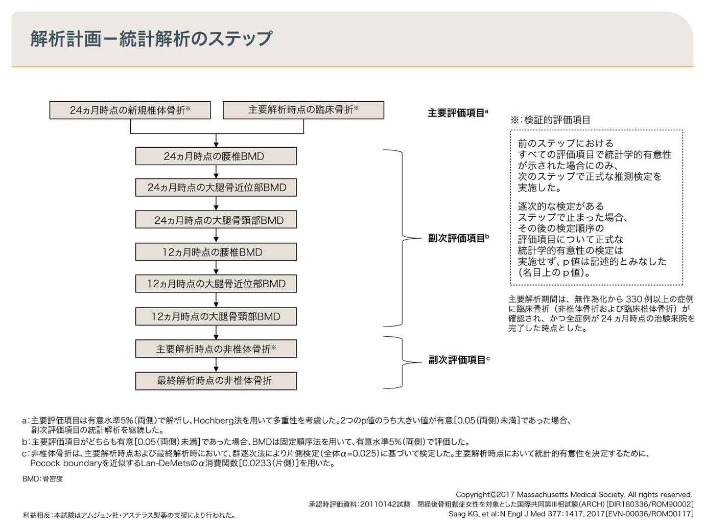 利益相反:本試験はアムジェン社・アステラス製薬の支援により行われた。 - 承認時評価資料:20110142試験 閉経後骨粗鬆症女性を対象とした国際共同第III相試験(ARCH)[DIR180336/ROM90002]