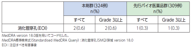 先行バイオ医薬品(アバスチン)の国内外臨床試験及び海外市販後において、消化管穿孔が認められた多くの患者さんに、腫瘍壊死、憩室炎、がん化学療法に関連する大腸炎等の腹腔内の炎症や、胃潰瘍等の合併がありました。「消化管など腹腔内の炎症を合併している患者さん」においては、投与の適否を慎重に判断する必要があります。また、投与期間中、このような患者さんにおいては特に注意し、腹痛などの予兆を見逃さずに、消化管穿孔への迅速かつ適切な対応を行う必要があります。