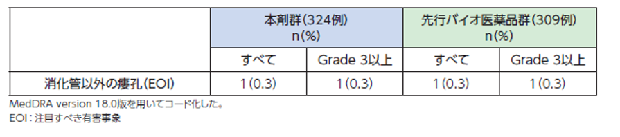 参考ですが、先行バイオ医薬品(アバスチン)は、血管外漏出の組織障害性に基づく分類において非壊死性薬剤※に該当します[1]。