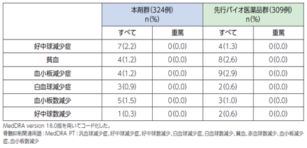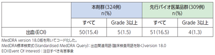 先行バイオ医薬品(アバスチン)の海外臨床試験において喀血の死亡例が認められ、既往歴として喀血が報告されていたことから喀血の既往歴が重篤な喀血発現のリスク因子として示唆されました。