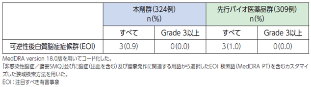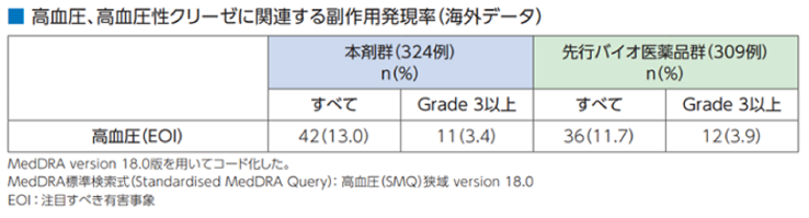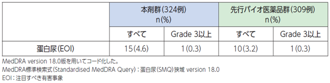 解説:先行バイオ医薬品において国内外での使用経験から重度の蛋白尿(ネフローゼ症候群)が認められており、本剤投与により高血圧が発現、また一般的に腎機能の変化は高血圧発現のリスク因子になることも考慮すると蛋白尿の発現についても高血圧と同様に注意喚起が必要と考えられる。本剤の投与中は尿蛋白の定期的な検査を行うことが望ましい。