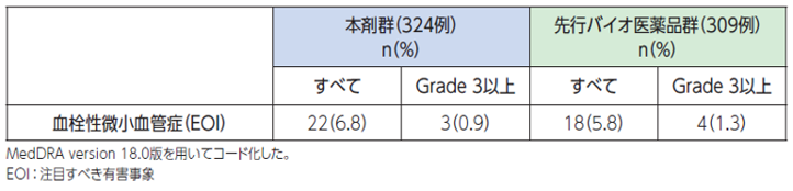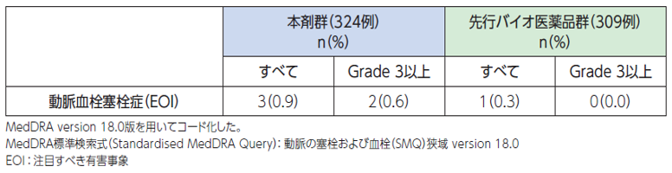 脳卒中、一過性脳虚血発作、心筋梗塞、狭心症、脳虚血、脳梗塞があらわれ、死亡に至る例が報告されているため、本剤の投与を中止し、適切な処置を行ってください。このような動脈血栓塞栓症があらわれた患者さんでは、重度の動脈血栓塞栓症が再発するおそれがあるので、本剤を再投与しないでください。